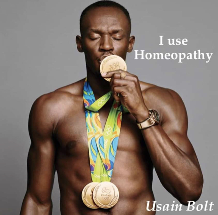 Usain Bolt, velocista olímpico e famoso ganhador de inúmeras medalhas de ouro, usa a homeopatia desde os 16 anos de idade. É paciente do médico esportivo alemão Hans-Wilheim Muller-Wohifahrt, que usa homeopatia em sua clínica alemã. Bolt voa para Munique para fazer check-ups com ele pelo menos duas vezes por ano.