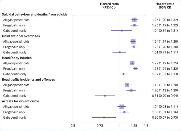 Em análises dentro de cada indivíduo, o tratamento com gabapentinoide foi associada a maior risco de comportamento e de suicídio mortes suicidas (razão de risco ajustada para 1,26 idade, intervalo de confiança de 95% 1,20-1,32), sobredosagem não intencional (1,24, 1,19 para 1,28), lesões na cabeça / corpo (1,22, 1,19 a 1,25), e acidentes de trânsito e ofensas (1,13, 1,06 a 1,20).