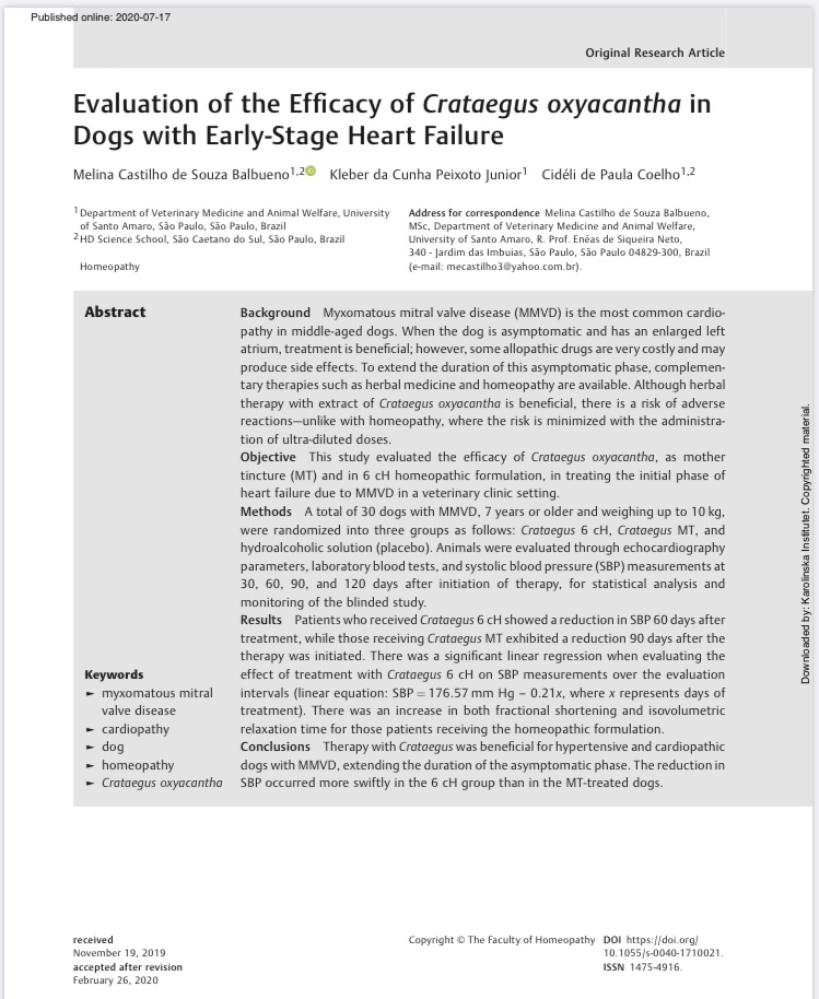 Recente estudo científico duplo-cego controlado por placebo em cães com insuficiência cardíaca em fase inicial comparou três intervenções: 1) tintura mãe de Crataegus 2) preparação homeopática 6 cH 3) placebo.