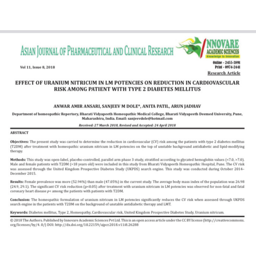 Pesquisadores do Bharati Vidyapeeth Homeopathic Hospital investigaram a redução do risco cardiovascular entre os pacientes com diabetes mellitus tipo 2 após o tratamento com Uranium nitricum homeopático em potências LM.