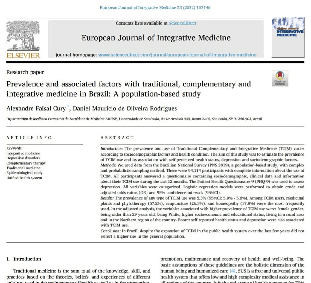 FONTE: Alexandre Faisal Cury; Daniel Maurício de Oliveira Rodrigues. Prevalence and associated factors with traditional, complementary and integrative medicine in Brazil: A population-based study. European Journal of Integrative Medicine