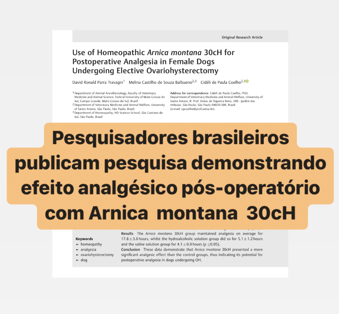 FONTE: Travagin DRP, Balbueno MCS, Coelho CP. Use of Homeopathic Arnica montana 30cH for Postoperative Analgesia in Female Dogs Undergoing Elective Ovariohysterectomy. Homeopathy. 2022 May;111(2):134-138. doi: 10.1055/s-0041-1732352. Epub 2021 Nov 15. PMID: 34781409.