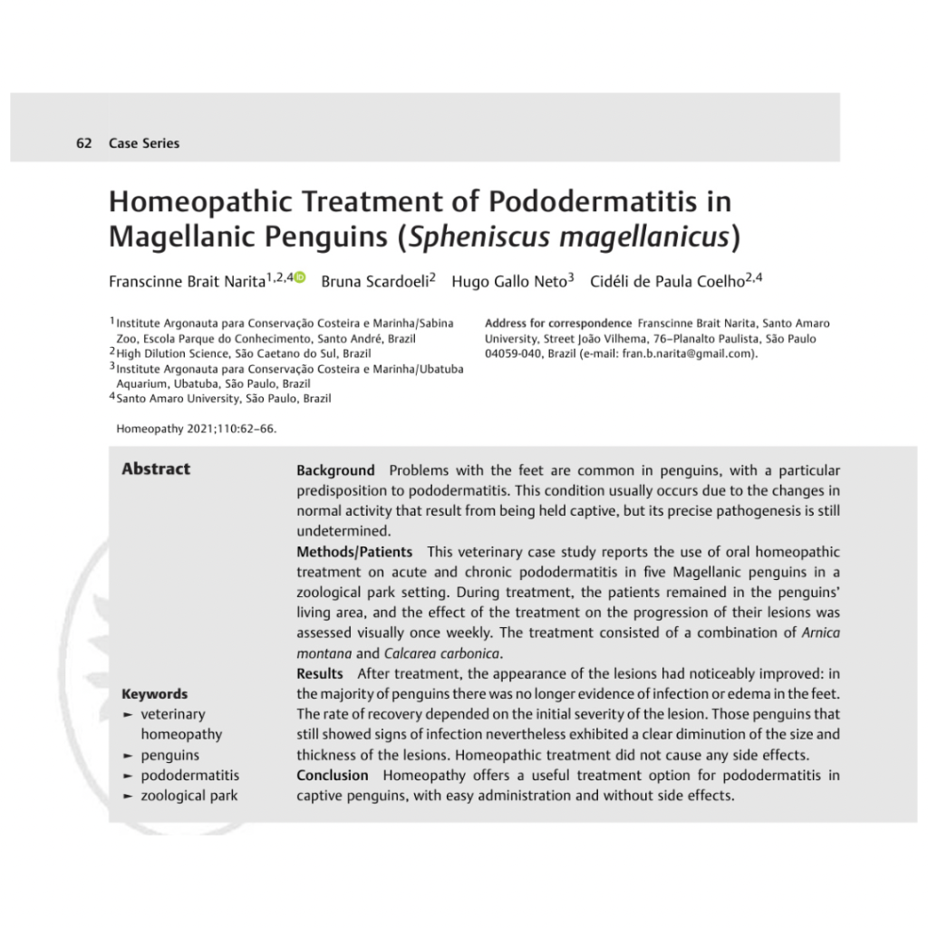 Os pesquisadores brasileiros Franscinne Brait Narita, Bruna Scardoeli, Hugo Gallo Neto, Cidéli de Paula Coelho publicaram um excelente estudo sobre tratamento homeopático da pododermatite em Pinguins de Magalhães.