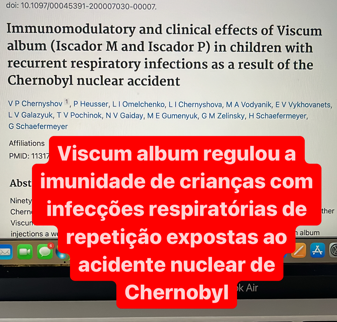 FONTE: Chernyshov VP, Heusser P, Omelchenko LI, Chernyshova LI, Vodyanik MA, Vykhovanets EV, Galazyuk LV, Pochinok TV, Gaiday NV, Gumenyuk ME, Zelinsky GM, Schaefermeyer H, Schaefermeyer G. Immunomodulatory and clinical effects of Viscum album (Iscador M and Iscador P) in children with recurrent respiratory infections as a result of the Chernobyl nuclear accident. Am J Ther. 2000 May;7(3):195-203. doi: 10.1097/00045391-200007030-00007. PMID: 11317168.