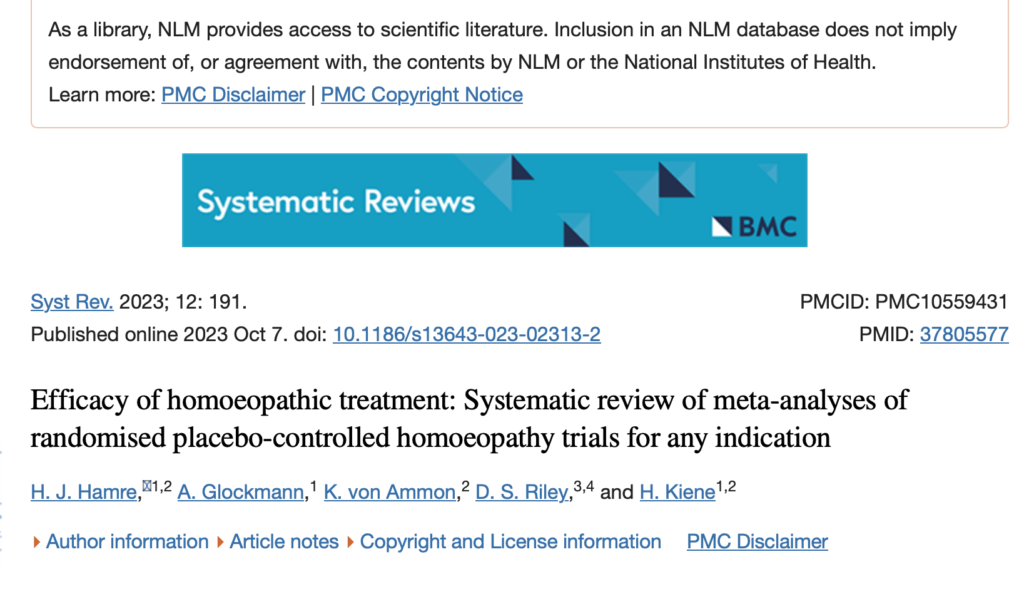 Referência: Hamre HJ, Glockmann A, von Ammon K, Riley DS, Kiene H. Efficacy of homoeopathic treatment: Systematic review of meta-analyses of randomised placebo-controlled homoeopathy trials for any indication. Syst Rev. 2023 Oct 7;12(1):191. doi: 10.1186/s13643-023-02313-2. PMID: 37805577; PMCID: PMC10559431.